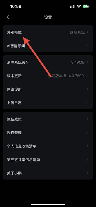 3、在设置页面中,找到外观模式选项并点击,进入外观模式页面。