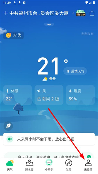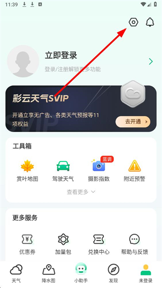 1、在彩云天气主界面,点击底部导航栏的未登录选项,进入个人相关页面。