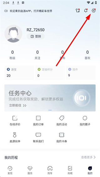 1、进入长安启源app,点击页面右上角的设置图标,进入设置页面。