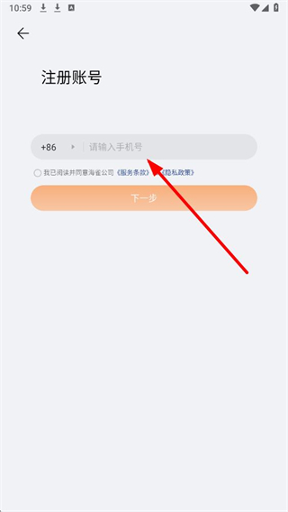 2、在注册页面输入要注册的手机号,勾选同意相关协议后,点击下一步。