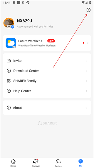 1、打开茄子快传进入个人中心页面,点击右上角的设置图标,进入Settings设置界面。