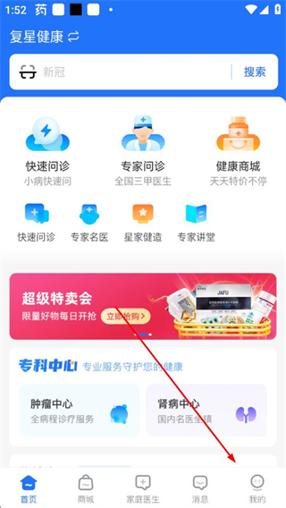 1、在复星健康app的首页,点击底部我的选项,进入个人中心页面。