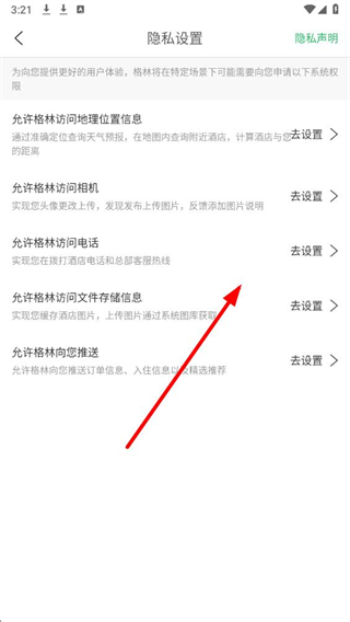 4、在隐私设置页面,选择需管理的权限,点击对应去设置按钮即可调整权限状态。