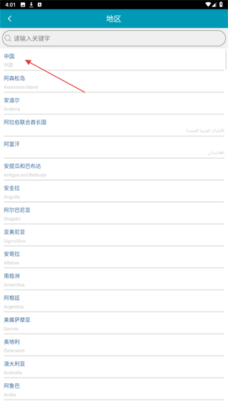 2、进入地区选择页面后,点击列表中的中国选项,确定当前的注册地区。