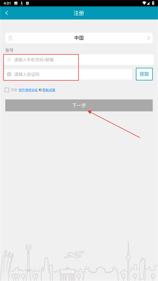3、在注册信息页面,输入手机号码并填写验证码,点击下一步按钮。