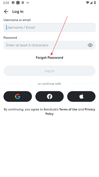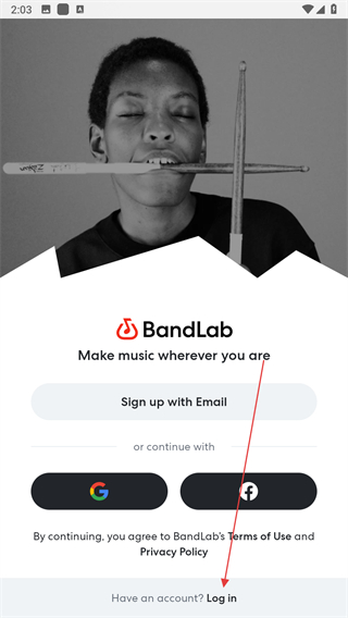 1、打开BandLab应用,在初始页面点击底部的Log in按钮,进入登录页面。