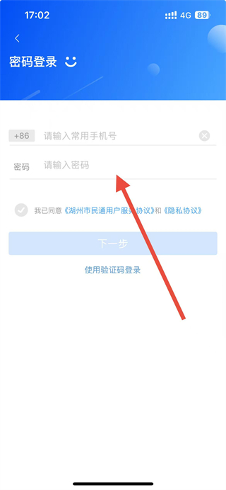 3、在页面依次输入手机号和密码,勾选同意协议后,点击下一步按钮,即可完成密码登录操作。