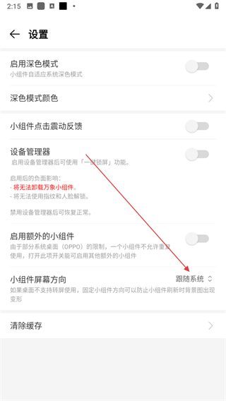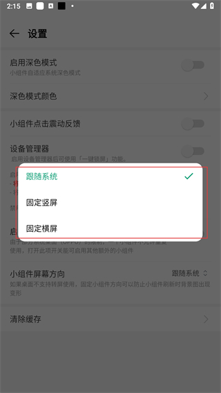 3、找到小组件屏幕方向选项,点击该选项弹出方向选择菜单。