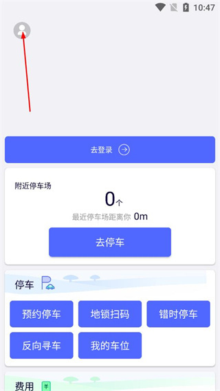 1、进入停车服务APP首页,点击左上角的头像图标,进入个人页面。