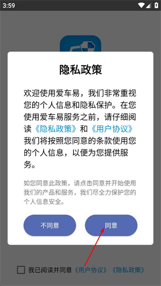1、打开爱车易应用,阅读弹出的隐私政策内容,点击同意按钮进入登录相关界面。