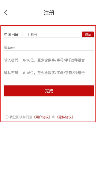 3、在注册界面输入信息,勾选用户协议和隐私协议,点击完成即可。