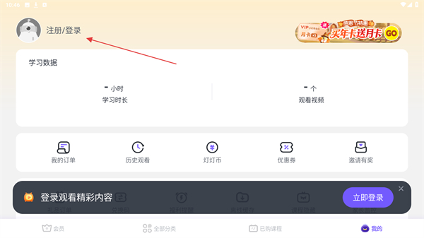 2、进入我的页面内,点击上方注册/登录的按钮。