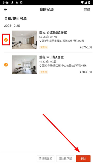 4、在选择状态下,勾选要删除的足迹记录,点击底部的删除按钮,即可完成删除。