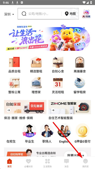 1、进入自如app,点击底部我的家选项,进入对应操作页面。