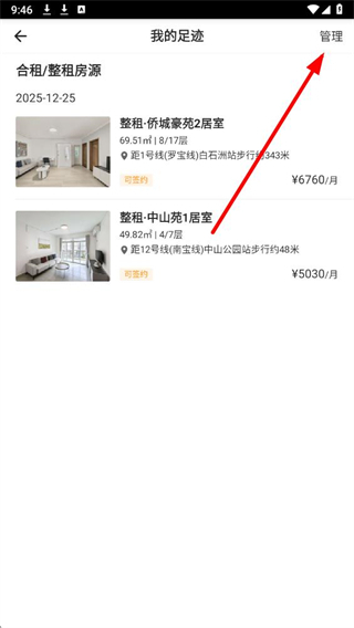 3、在我的足迹页面,点击右上角的管理按钮,进入足迹记录的选择状态。