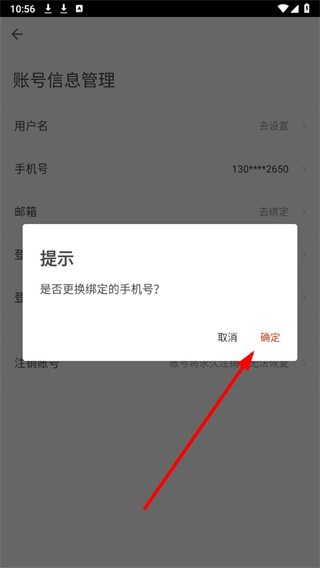 3、在该页面点击手机号选项,弹出是否更换绑定的手机号的提示框,点击确定。