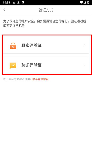5、在验证方式页面,选择原密码验证或验证码验证完成身份验证,后续按提示验证,即可完成换绑。