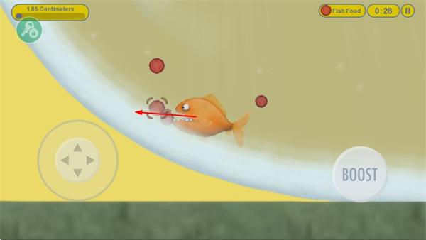 3、操控小鱼靠近食物并吃掉它,逐步增长小鱼的体型,推进游戏进程。