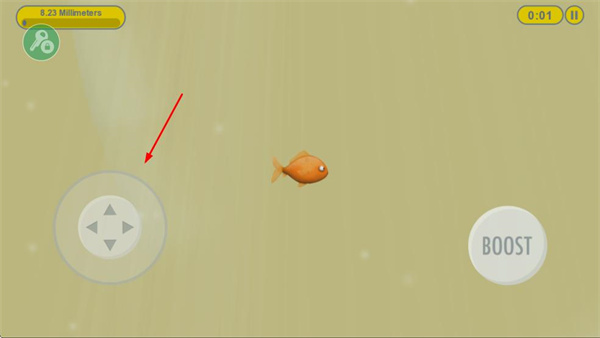 2、进入游戏后,通过方向按钮操控小鱼移动,在场景中探索并寻找食物。