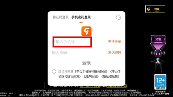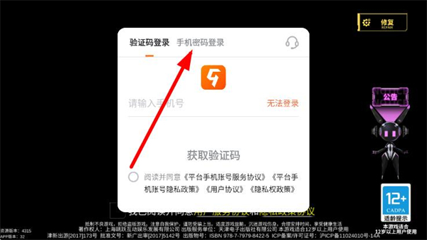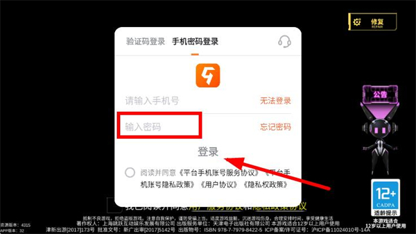1、打开300大作战,点击上方的手机密码登录选项。