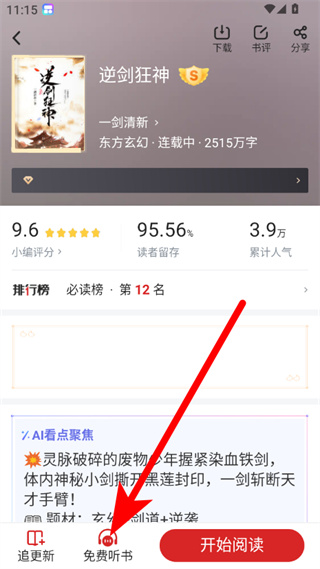 2、在小说详情页面,点击免费阅读选项,进入小说阅读界面。