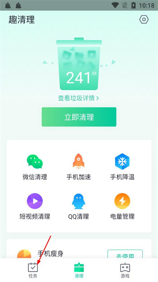 2、在趣清理主界面,找到页面底部左侧的任务选项,点击该选项进入任务页面。