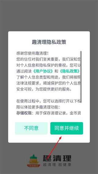 1、打开趣清理软件,查看弹出的趣清理隐私政策,点击同意并继续按钮进入主界面。