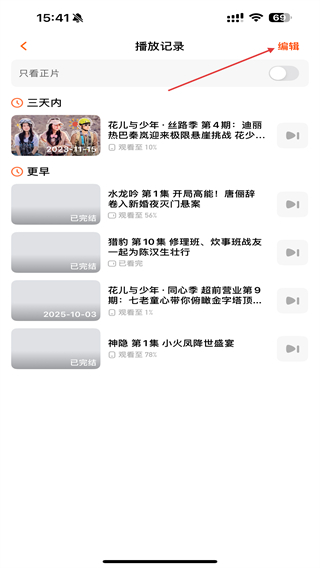 3、点击播放记录页面右上角的编辑按钮,每条记录前会出现选择框。