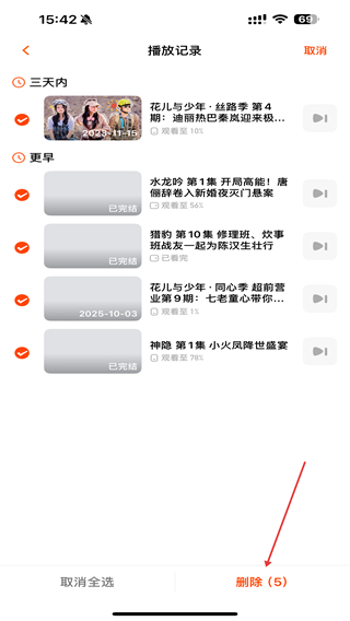 4、勾选需要删除的播放记录,点击删除按钮即可完成。