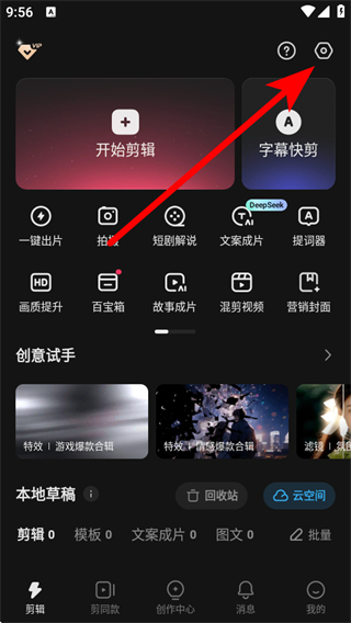 1、打开快影的APP,进入首页点击右上角设置的图标。