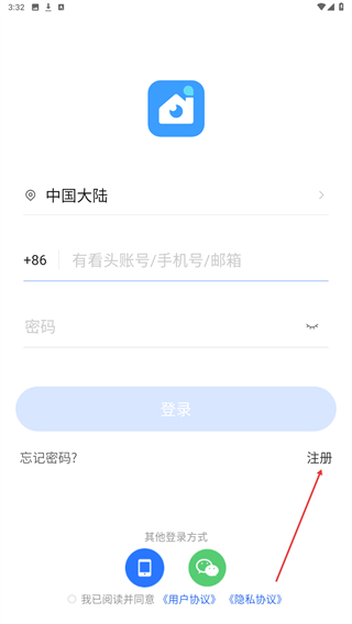1、打开有看头监控APP,在登录页面点击注册按钮。