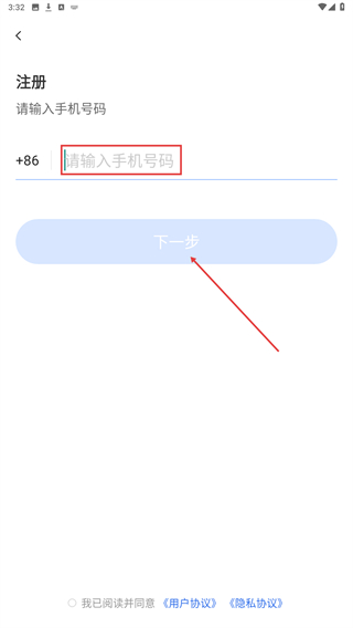 3、跳转至注册页面后,填写手机号码,点击下一步。
