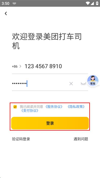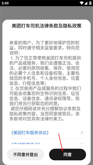 1、打开美团打车司机软件,出现法律条款及隐私政策弹窗,点击同意按钮。
