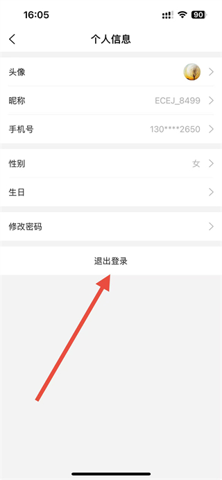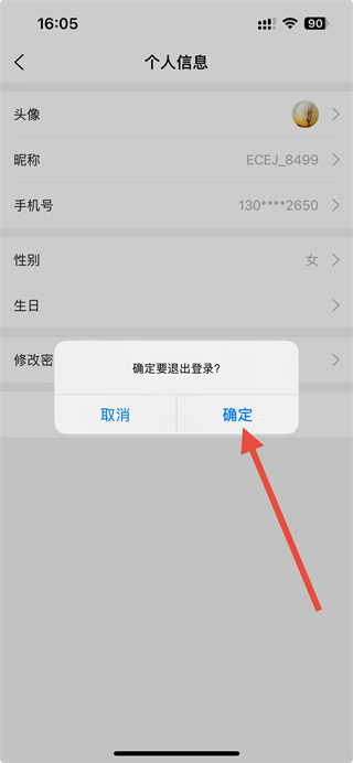 3、在个人信息页面,点击底部的退出登录选项,弹出确认窗口。