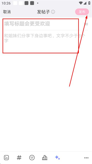 2、进入发帖子页面,填写标题和分享内容,内容填写完成后,点击右上角的发布。