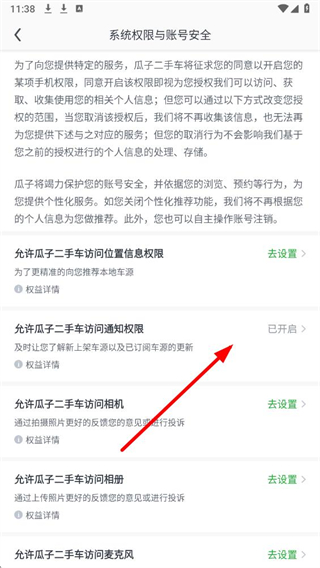 4、在系统权限与账号安全页面,点击对应权限后的去设置即可调整权限状态。
