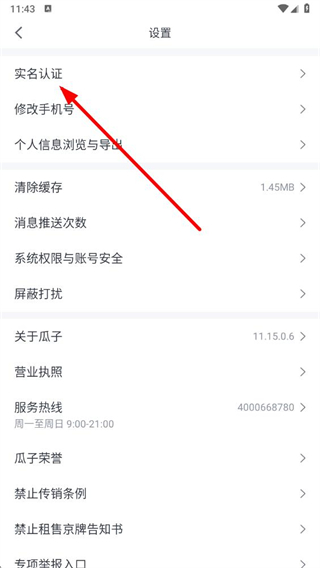 3、在设置界面中,找到实名认证选项并点击,进入实名认证页面。