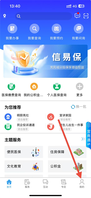 1、在晋来办app首页界面,点击底部我的选项,进入个人页面。