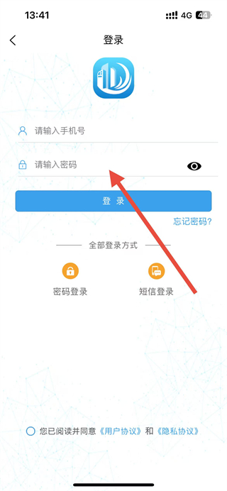 4、在密码登录界面,输入手机号、密码,勾选协议后,点击登录按钮,即可完成账号登录。