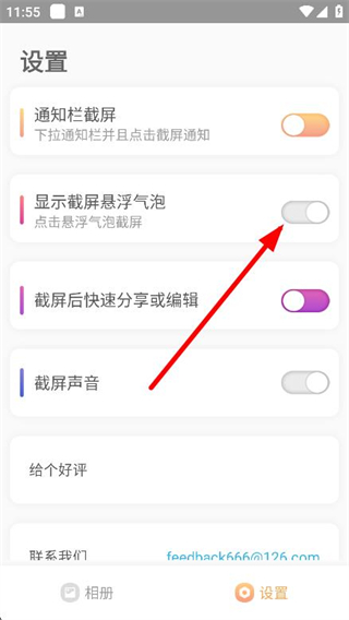 2、进入设置页面后,点击显示截屏悬浮气泡的开关。