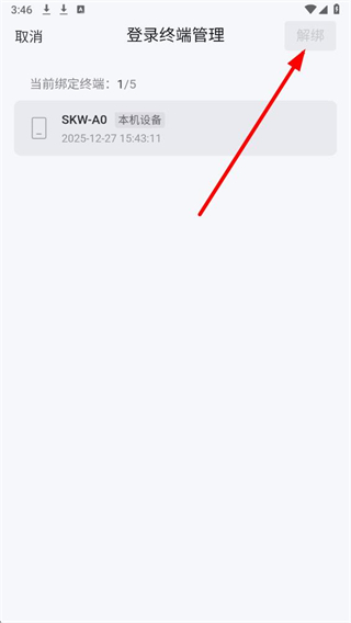 4、在页面选择设备后,点击右上角的解绑按钮,按提示完成设备解绑操作。