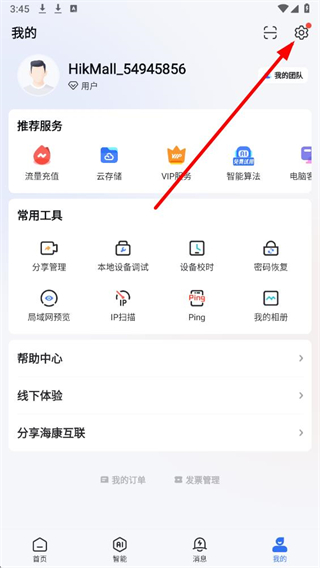 1、进入海康互联app后,在个人页面,点击右上角的设置选项。