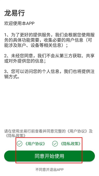 1、查看龙易行的用户协议及隐私政策,勾选对应选项后点击同意开始使用按钮,进入首页。