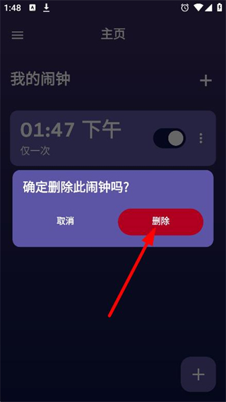 3、在确认弹窗中,点击删除按钮即可删除闹铃。