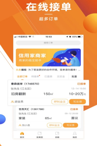 信用家商家App,专门为装修平台商户打造的一款移动工具,实现装修公司手机轻松接单,查看订单,处理订单业务,有效帮助装修公司提升工作效率,增长业绩。 信用家互联网装修平台诚邀各地装修公司入驻,立即开启接单盈利。