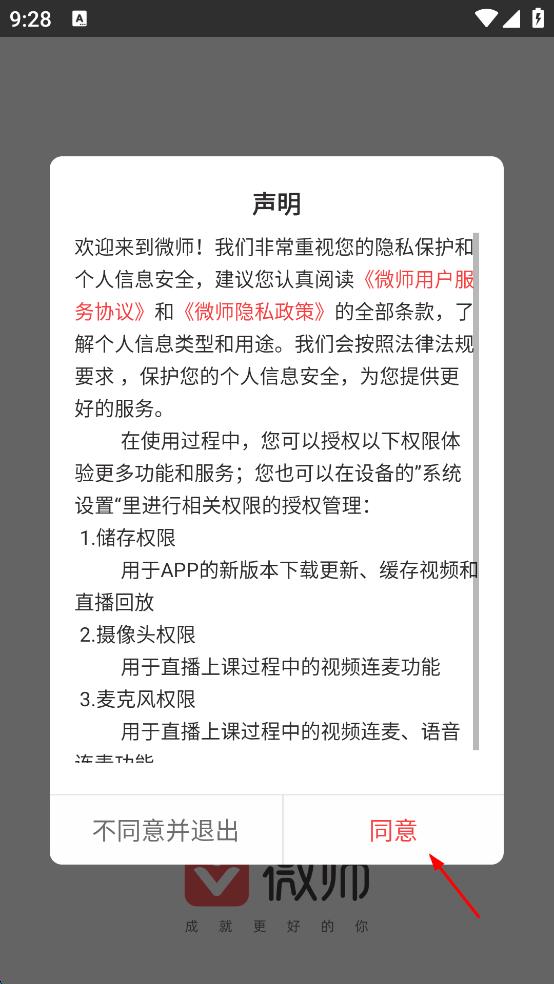 1、打开微师软件,出现声明弹窗,认真阅读相关内容后,点击同意按钮。