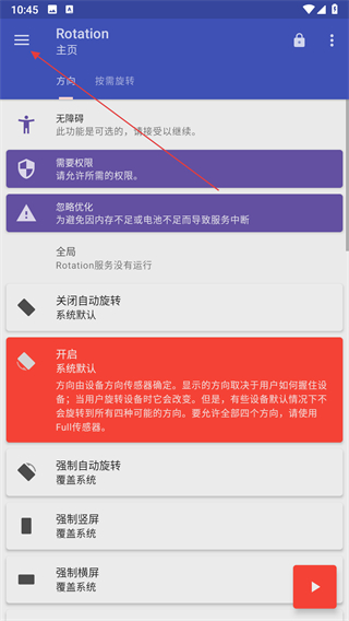 1、进入主页可看到无障碍,需要权限,忽略优化等提示,还有关闭自动旋转,开启,强制自动旋转等方向设置选项,根据需求选择方向设置,若要启动服务,点击启动按钮。