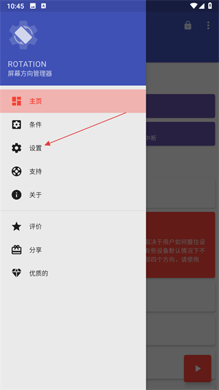2、在侧边功能列表中找到设置选项,点击该选项进入Rotation的设置界面。
