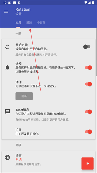 3、进入Rotation的设置界面之后,在设置界面顶部切换到通知标签页。