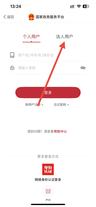 2、在登录选择界面中,点击法人用户选项,切换至法人用户的登录与注册相关页面。